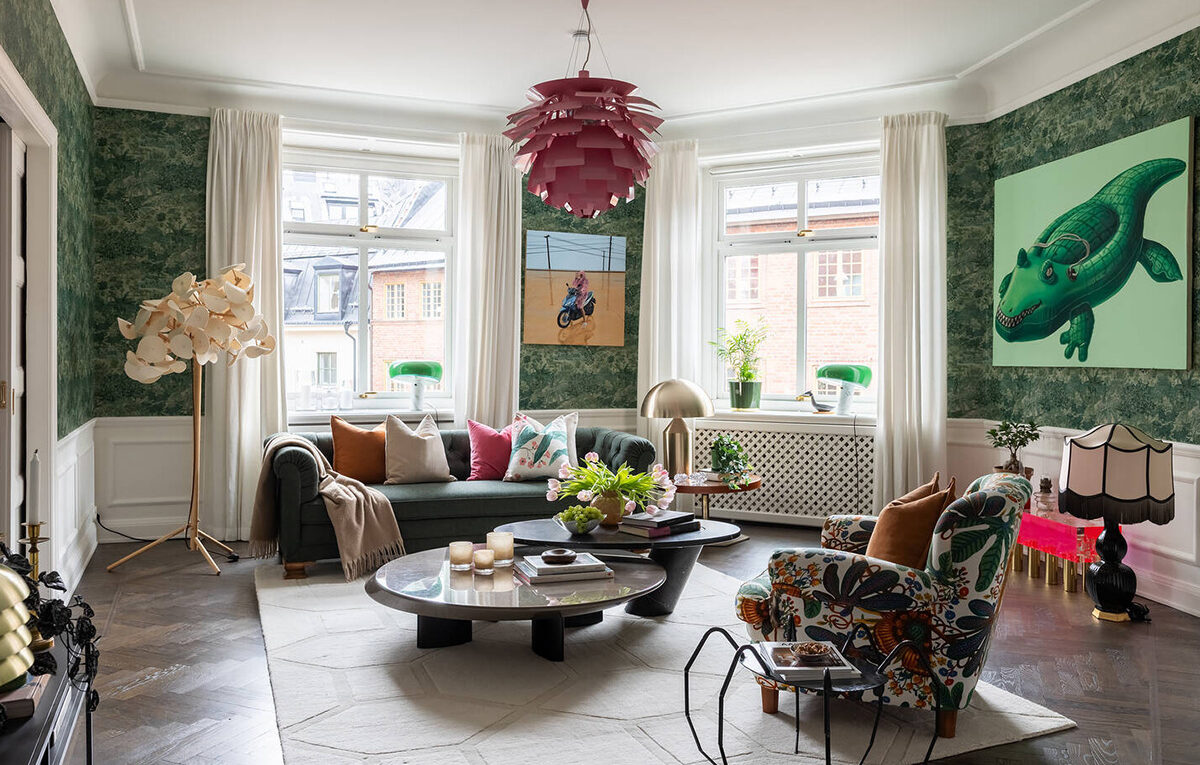 Интерьер этой квартиры в Стокгольме — полная противоположность популярному сегодня тренду на спокойные и монохромные натуральные пространства. Каждая комната здесь пестрит активными принтами и смелыми цветовыми сочетаниями, и в центре всей этой концепции — цветочные обои. Они здесь повсюду: в гостиной, спальнях, в ванной. А ещё в квартире есть красная кухня, обеденные стулья в зебру и яркое искусство на стенах. Очень экспрессивный интерьер!