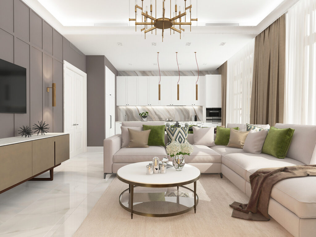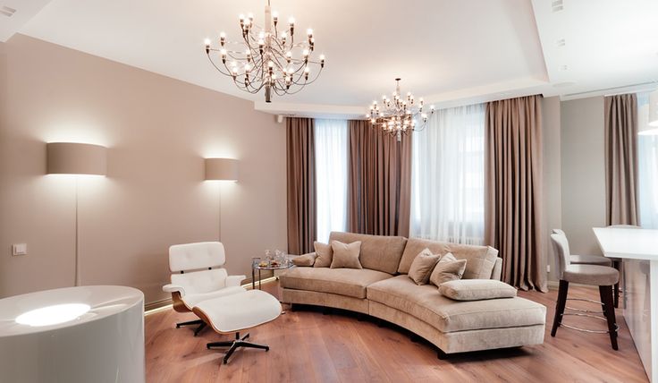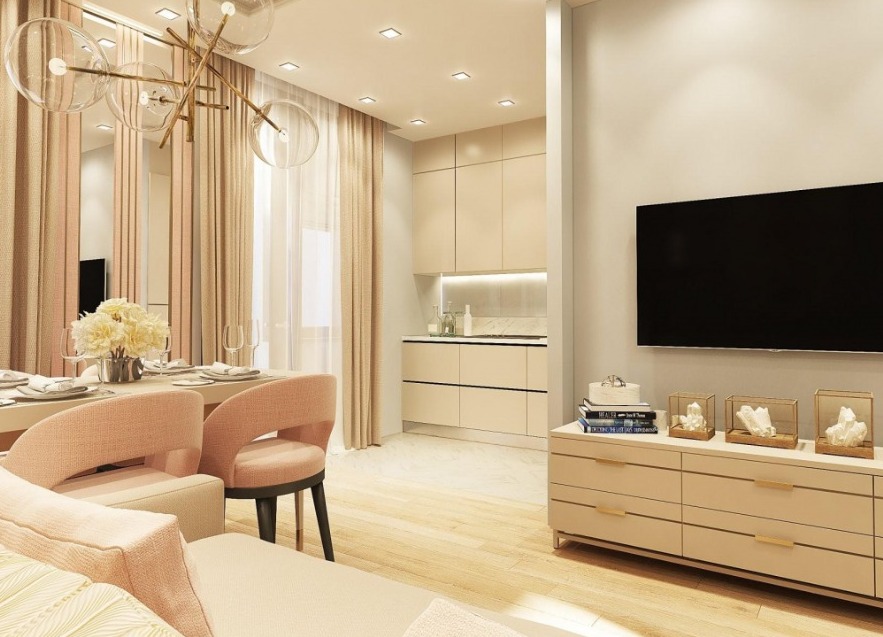 При оформлении квартиры в бежевой гамме особое внимание следует уделить планировке и зонированию пространства.