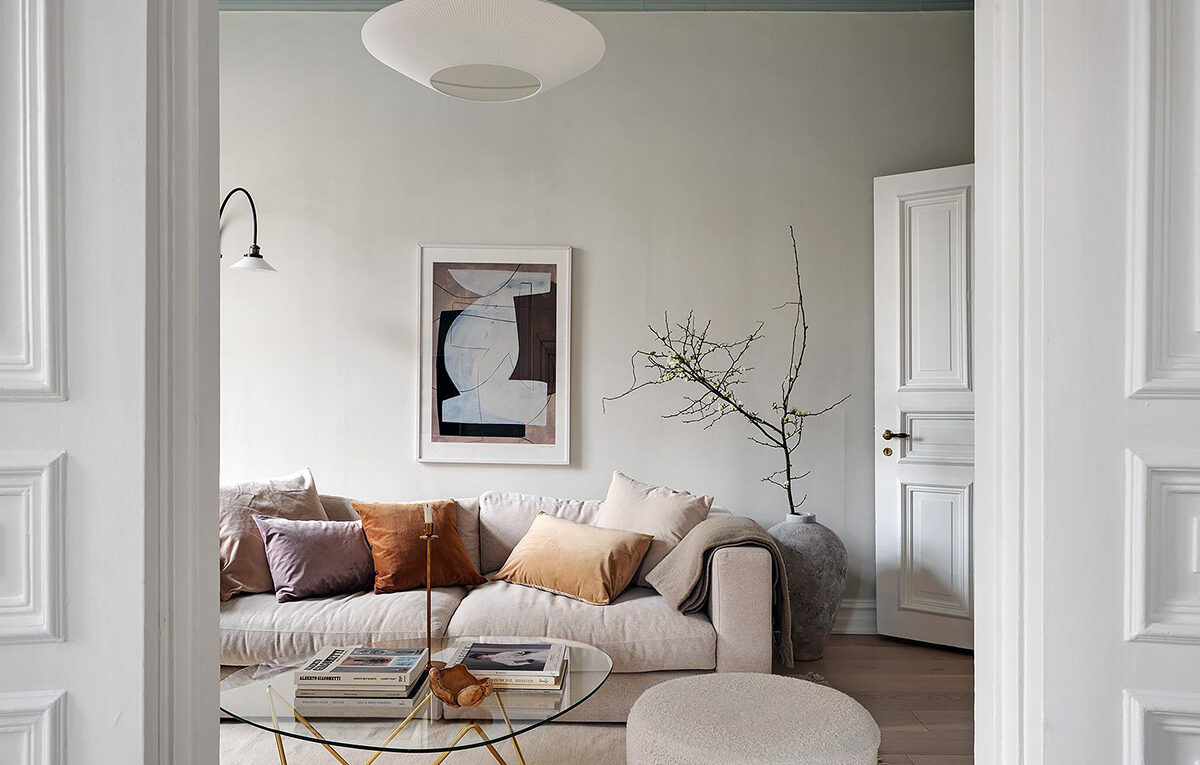 Голубой потолок в гостиной и стильные детали: спокойный интерьер в Гетеборге (71 кв. м)