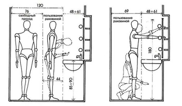 - перед раковиной должно быть свободное место — не менее 69 см;