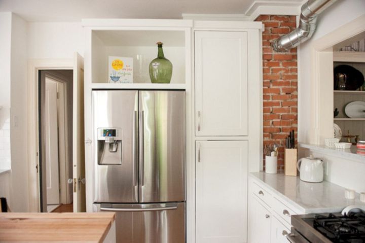 Холодильник можно установить в специально отведенной нише в мебельном гарнитуре. Такое решение позволит скрыть его от прямого взгляда, сохранив при этом доступ к технике.