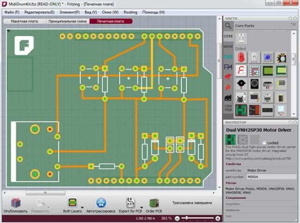 После загрузки библиотеки можно приступать к рисованию схемы. Сначала можно «перетащить» нужные элементы из библиотек на рабочее поле, развернуть их (если понадобится), расставить и связать линиями связи. После того как схема готова, если необходимо, в меню выбираем строку «преобразовать в плату» и ждем некоторое время. На выходе будет готовая печатная плата с расположением элементов и дорожек. Также можно в 3D варианте посмотреть внешний вид готовой платы.