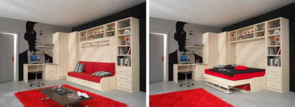 • Если гостиная спальня небольшая (меньше 16 квадратов) или установить кровать и диван не представляется возможным из-за особенностей планировки, решение есть в единственном варианте — использовать мебель-трансформер. Если площадь позволяет, можно использовать любой из способов.