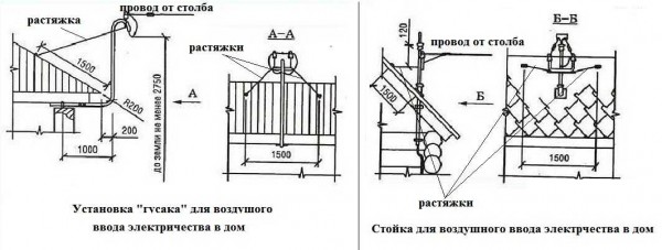 - Ввод кабеля в дом должен располагаться на высоте не менее 2,75 м. Если высоты дома хватает, на стену монтируется распределительный щиток с УЗО, к нему подключается кабель от столба. Если дом имеет меньшую высоту, устанавливают специальную стойку (трубостойку). Она может быть изогнутой формы называют «гусак» (на рисунке слева) или прямой (на рисунке справа). Отличаются эти два способа ввода и методом крепления к стенам дома (см фото).