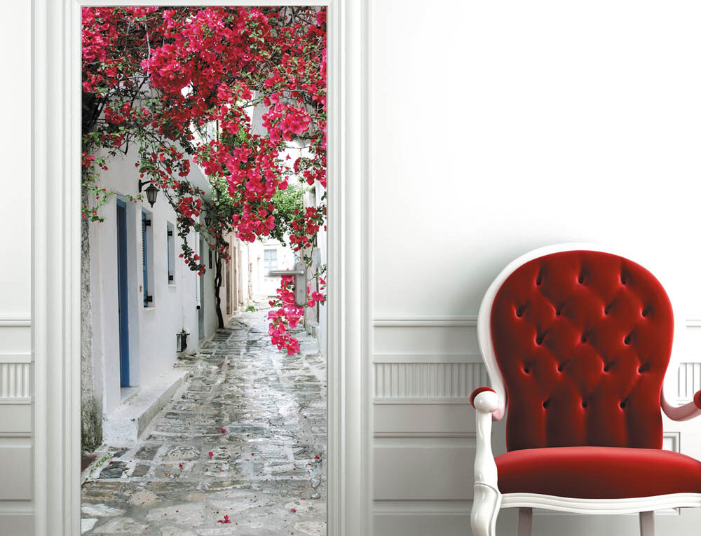 Не имеющие клейкую основу фотообои на дверь более просты для нанесения. Процесс оклейки такой плёнкой не имеет столько тонкостей и нюансов, как и в случае с самоклеющимся материалом. Кроме того, процесс нанесения данного вида отделочного материала подобен технологии оклейки помещений обычными обоями. Для многих, кто уже сталкивался с такими ремонтными работами, процесс наклейки данного типа фотообоев не поставит в затруднительное положение.