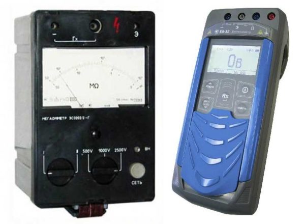 Так выглядит стрелочный мегаомметр (слева) и электронный (справа)