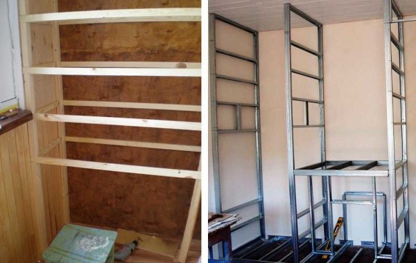 Если делают шкаф на балконе, одна сторона крепится к стене, а вторая — к элементам каркаса или только вверху и внизу — к потолку и полу (исползуем усиленные металлические уголки).