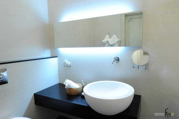 Для тех, кто хочет создать неповторимый дизайн ванной, есть ещё одна интересная и пока малоиспользуемая возможность — сделать подсветку в полу. Это сложная работа, но эффект получается очень интересный.