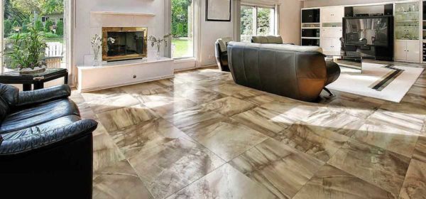 • Полированный и полуполированный (отличается степенью полировки и блеска). Этот вид имеет наиболее эффектный вид. И, хотя стоит дороже остальных видов, используется достаточно часто. Но стоит иметь в виду, что в процессе эксплуатации полировка становится тусклее и со временем поверхность становится матовой. Есть полированного керамогранита еще один недостаток — полировка открывает закрытые ранее поры. В результате пролитая жидкость впитывается, остаются следы. Потому многие производители покрывают плитки керамогранита лаком. Если такого покрытия нет, его надо нанести после укладки. Еще один неприятный момент: если на такую поверхность попадает жидкость, пол становится очень скользким.