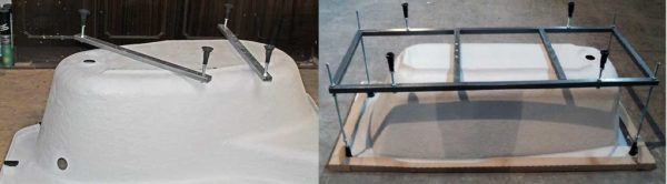 Каркас или ножки к акриловой ванны иногда идут в комплекте, иногда — в расширенной комплектации. Разница между ножками и каркасом значительная, и не только в цене. Ножки, установленные на планки, крепятся только к усиленному дну, обычно на два-четыре самореза. Борта при этом остаются без опоры (внизу фото слева). Каркас, чаще всего, более массивный, сделан из более толстой профилированной трубы (квадратного сечения), имеет больше точек опоры. Часть опор идет от бортов ванны, другая часть — крепится к дну, подпирая его (фото справа).