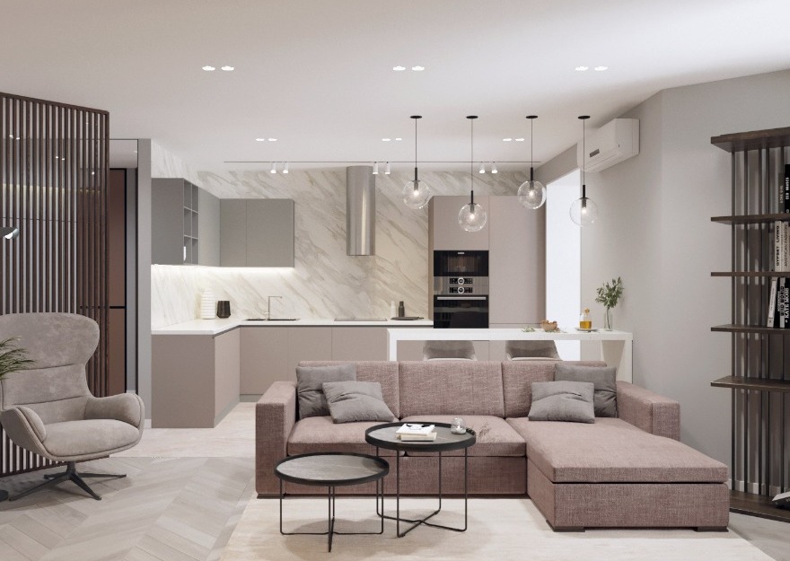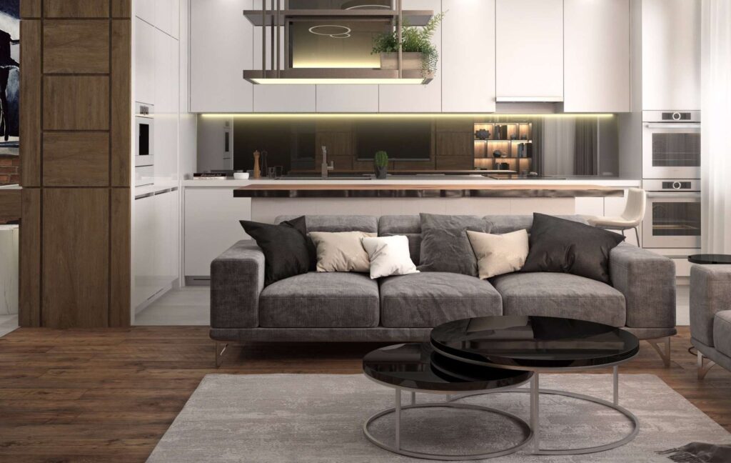 Используйте одни и те же отделочные материалы, фактуры и декоративные элементы как в кухне, так и в гостиной. Это «сшивает» пространство воедино.