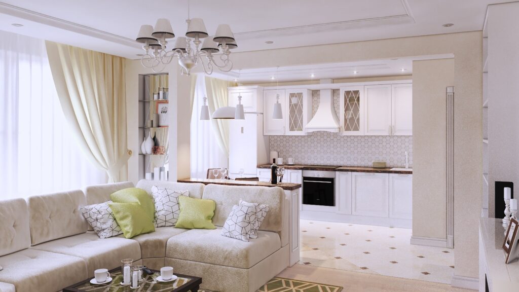 Для создания гармоничной, цельной композиции важно также обеспечить стилистическую интеграцию кухонной и гостиной зон.