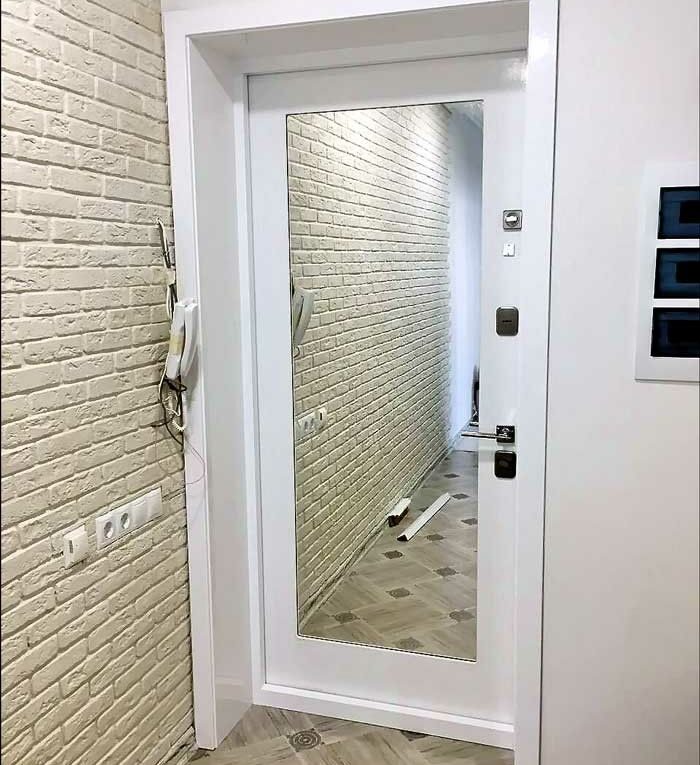 Белая входная дверь может быть со стеклом в виде зеркала. Его располагают на внутренней поверхности полотна, поверх любой из отделок.