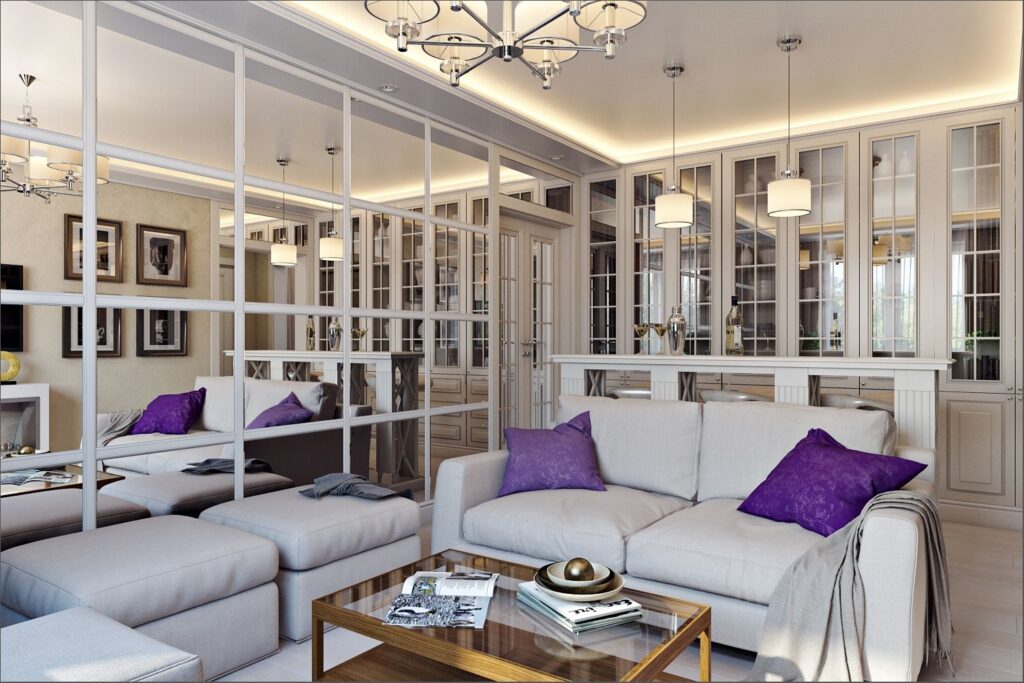 Использование зеркал и стеклянных поверхностей усиливает эффект отражения и увеличивает визуальный объем.