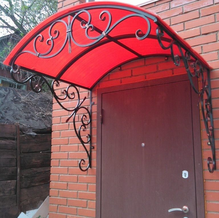 Следующий шаг – выгнуть из квадратов или арматурного прута различные фигурные элементы. Их вставляют в каркас и также приваривают во всех местах соприкосновения. Далее все работы с каркасом проводятся аналогично первому варианту: грунтовка, покраска, фиксация саморезов, крепление конструкции над дверью и монтаж листов поликарбоната.