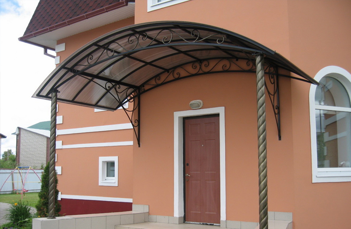 Главное предназначение навеса — защищать крыльцо здания и входные двери от прямых солнечных лучей, дождя и снега. Козырьки могут отличаться размерами, формой, дизайном, способом установки. Их изготавливают из разных строительных материалов.