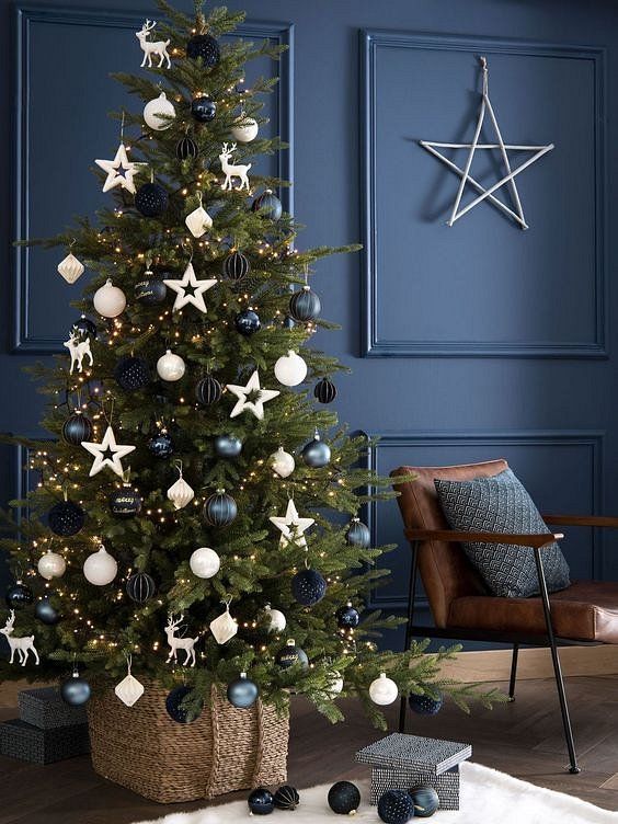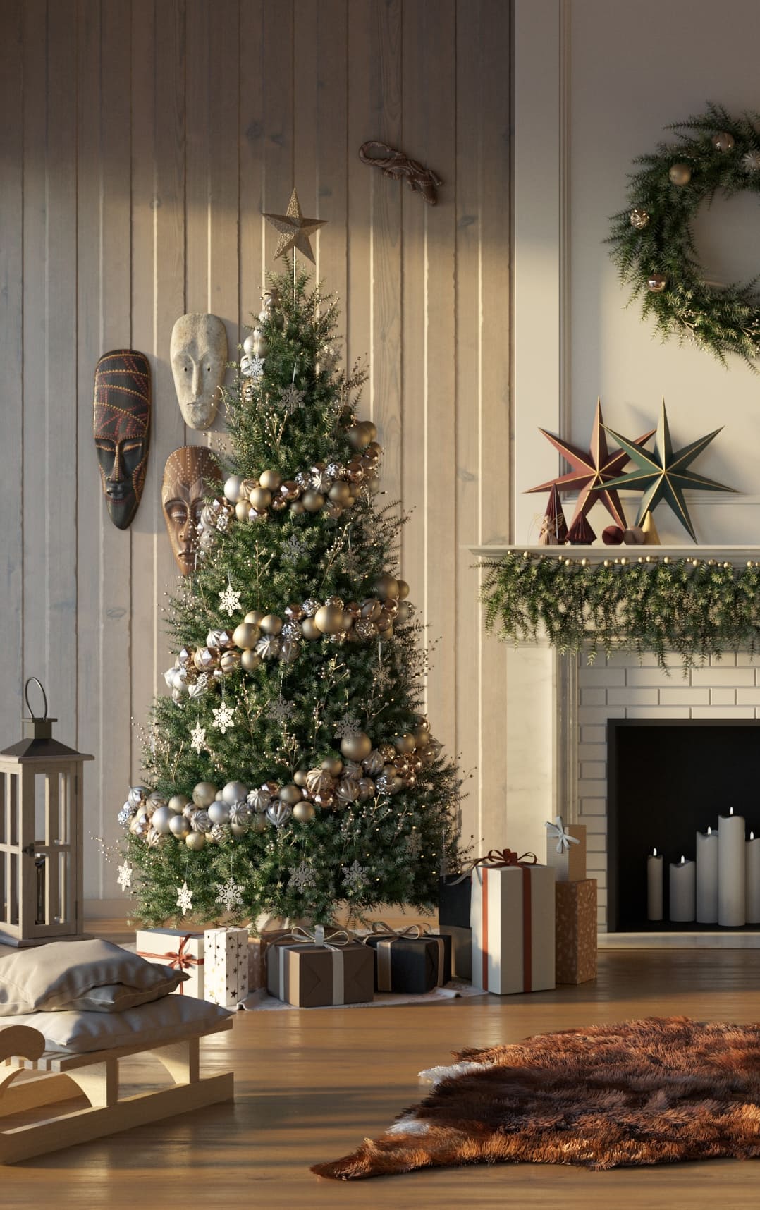 Сделайте акцент на форме ели и фактуре хвои. Ограничьтесь несколькими лаконичными, но выразительными украшениями в геометрических формах.