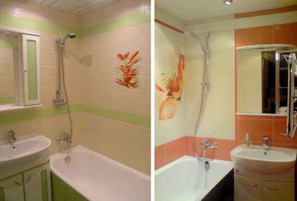 Чтобы ванная при этом не выглядела слишком уж стерильной, светлый цвет разбавляют яркими элементами. Вариантов несколько — бордюр из более темной плитки, темная нижняя часть стены (примерно — нижняя треть). Если нижняя част  стены темная, пол делают того же цвета или очень близкого, если не удается найти плитку того же тона.