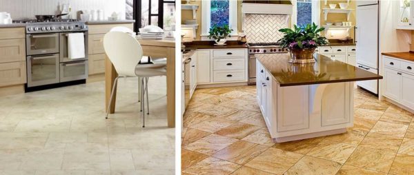 Напольное покрытие для кухни из пробки (слева) и наливных полов (справа)