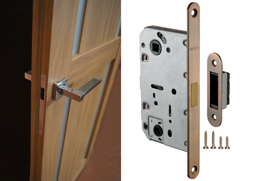 Такие магнитные замки могут снабжаться фиксатором, надежно запирающим проход. Обычно они предназначены для межкомнатных дверей, ведущих в ванную или туалет.