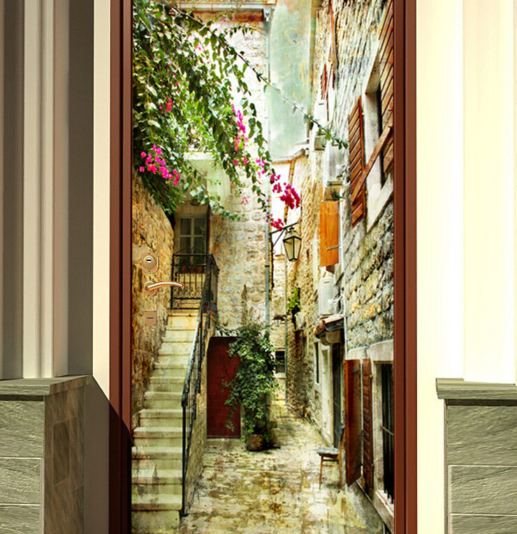 Если дверное полотно находится в конце коридора, то в этом случае идеальным выбором будет та наклейка, на которой изображен какой-либо красивый переулок, уходящий в даль. Таких картинок очень много и выглядят они очень и очень интересно.