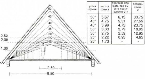 Угол наклона отображен через отношение высоты конька и половины ширины здания