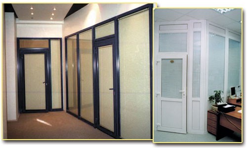 При помощи алюминиевых офисных дверей также сооружаются и перегородки, использующиеся компаниями для оптимизации имеющихся площадей. Посредством перегородок возможно как создание полностью изолированных рабочих кабинетов или комнат для переговоров, так и зонирование офисного пространства.