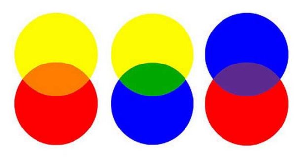 Как известно, выделяют три основных (красный, синий, желтый) и три дополнительных цвета (фиолетовый, оранжевый, зеленый). Это базовые цвета. Соединяя их, можно получить все другие цвета и их оттенки (теоретически да, на практике немного другая ситуация). На рисунке основные цвета представлены кругами, а дополнительные образуется в месте пересечения пар. Эти пары показывают, как смешивание цветов основного ряда дает дополнительные.