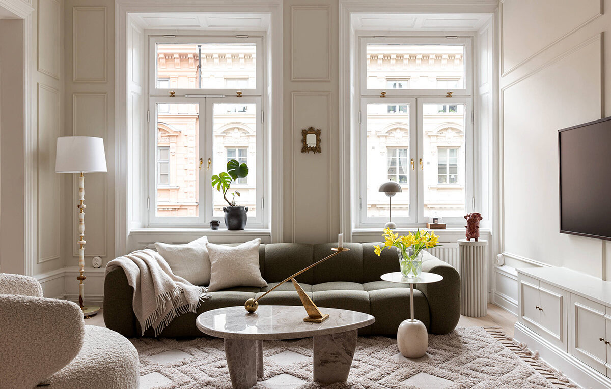 В этой шведской квартире, историческое наследие и модный современный декор образовали очень обаятельное сочетание. Её стены, потолки и корпусная мебель