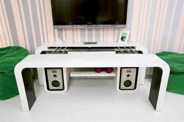 Есть стол-трансформер в виде комода, в котором оборудовано рабочее место. Так как работа сегодня почти всегда связана с оргтехникой, есть где разместить экран, клавиатуру, системный блок. А уж ноутбуков разместить можно вообще пару штук.