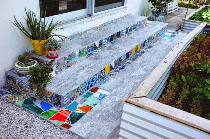 Декорируйте лестничные ступени, используя разноцветные плиточные фрагменты.