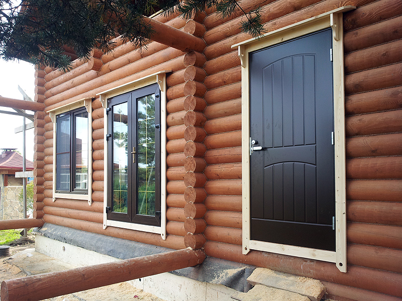 Как правило, хозяева срубов выбирают обшивку деревом, чтобы дверь хорошо вписывалась в общий ансамбль. Но у каждого свой вкус и нередко можно увидеть просто хорошо покрашенную входную металлическую дверь, установленную в деревянном здании.