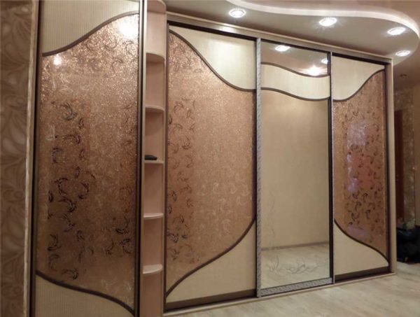 Этот предмет мебели не назовешь незаметным - Комбинации описанных выше материалов и технологий. Наиболее декоративный эффект получается если совместить несколько материалов. Количество комбинаций очень велико и можно подобрать фасад для углового шкафа купе под любой интерьер и вкус.